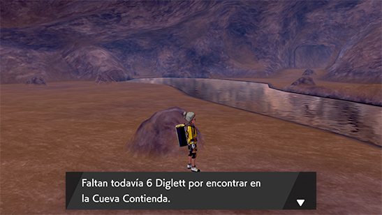 Sube de nuevo a la cueva central y sube más a la cueva del lateral izquierdo (mirando desde la entrada de Playa Desafío). En esta zona hay otro Diglett a la izquierda antes del río subterráneo, y otro más subiendo por el río a la izquierda junto a un Nido Dinamax (detrás de una roca).