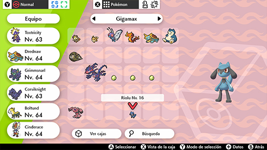 La evaluación de los Valores Individuales de tus Pokémon la puedes hacer directamente desde las Cajas del PC pulsando + en el perfil del Pokémon. Para desbloquear esta función debes ganar 6 combates en la Torre Batalla.