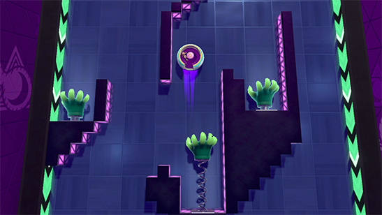 - Prueba del Gimnasio: La prueba consiste en superar varias zonas de caída libre sobre una plataforma que puedes controlar girando el Joystick en un sentido o en otro, aprovechando las garras de fantasma para recuperar impulso. Por el camino tendrás que derrotar a varios Entrenadores.