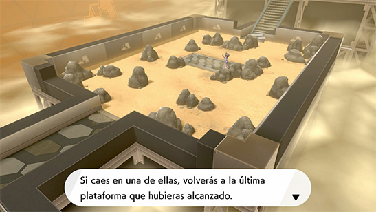 - Prueba del Gimnasio: La prueba consiste en avanzar por un laberinto de trampas ocultas en el suelo, para lo cual te entregan un detectahoyos que te indica cuando estás cerca de caer en una trampa. Si llegas a una plataforma de suelo de hormigón, cuando caes en una trampa vuelves a esa plataforma. La última zona además tiene una tormenta de arena que dificulta ver por donde vas. Por el camino te retan varios Entrenadores.