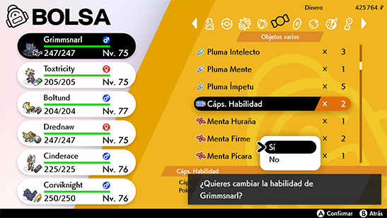 » El cambio de Habilidad se produce entre las Habilidades normales que puede tener esa especie de Pokémon, por lo que no sirve para obtener la Habilidad oculta. Si una especie de Pokémon sólo tiene una Habilidad normal o el Pokémon tiene su Habilidad oculta, no se puede usar este objeto.