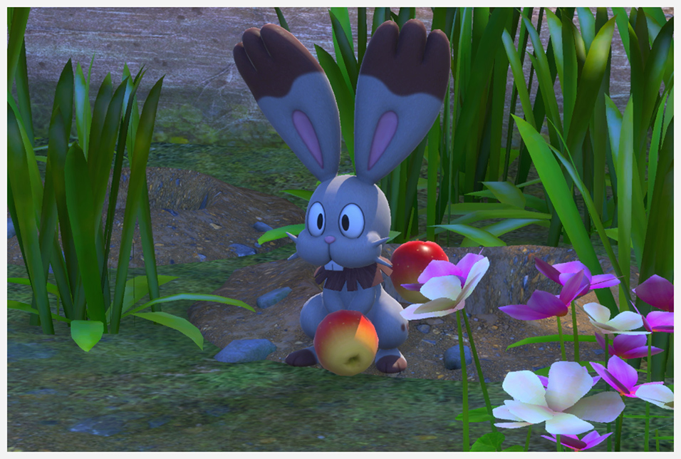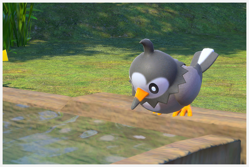 Mientras bebe del abrevadero Tirar Blanzanas a los Starly posados en el árbol y al final aparece un Starly entre las flores, al cual si lanzas una Blanzana se pone a dar saltos a su alrededor |