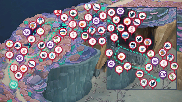 - Gruta Marina: Esta zona oculta se desbloquea lanzando un Orbe Lúmini al primer Clawitzer (a partir del Nivel Investigador 2) antes de que dispare contra las rocas y luego usando el Radar para acceder a la gruta. Te permite ir por una gruta marina más oscura que esconde varios Pokémon nuevos.