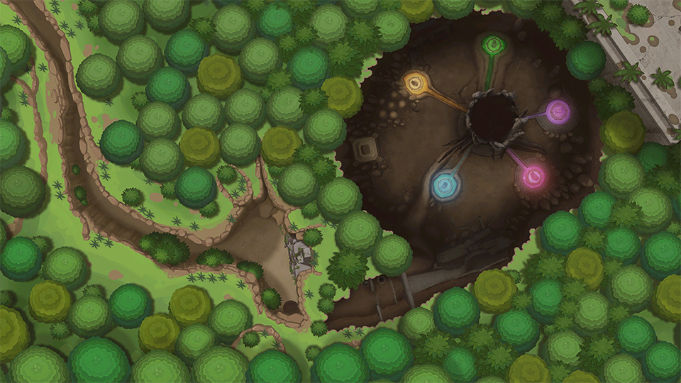 Enciende las Cristaflores al lado de las cinco estatuas y la Cristaflor del final para activar el Pilar de Luz, y luego mira detrás de ti |