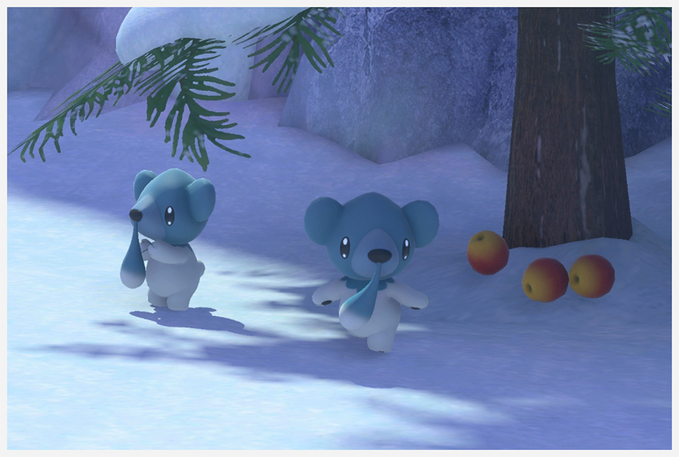 Tirar Blanzana y hacer foto en el momento Mientras se come una Blanzana Asomándose fuera del hoyo en la nieve Erguido al ver a Weavile en Nivel Investigador 3 |