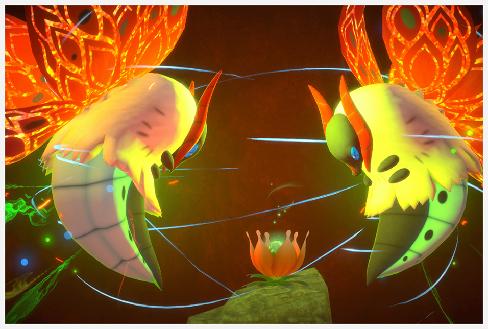 Ambos Volcarona en estado Lúmini intercambian energía junto a una Cristaflor |